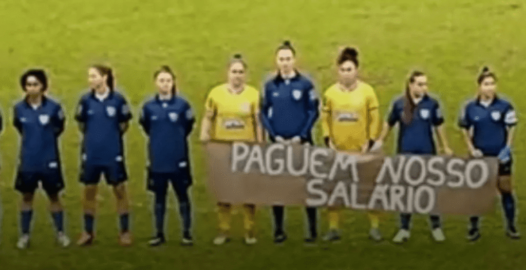Jogadoras do Avaí/Kindermann entram em campo com faixa de protesto por salários atrasados