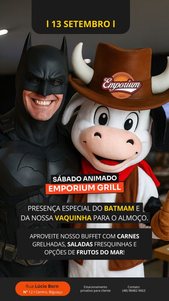 Sábado especial no Emporium Grill terá presença do Batman e da mascote da casa