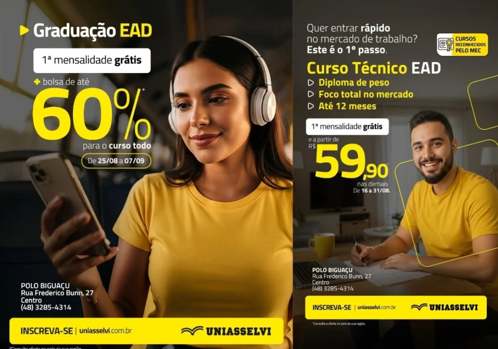 Uniasselvi Biguaçu oferece condições especiais em cursos de Graduação e Técnicos EAD