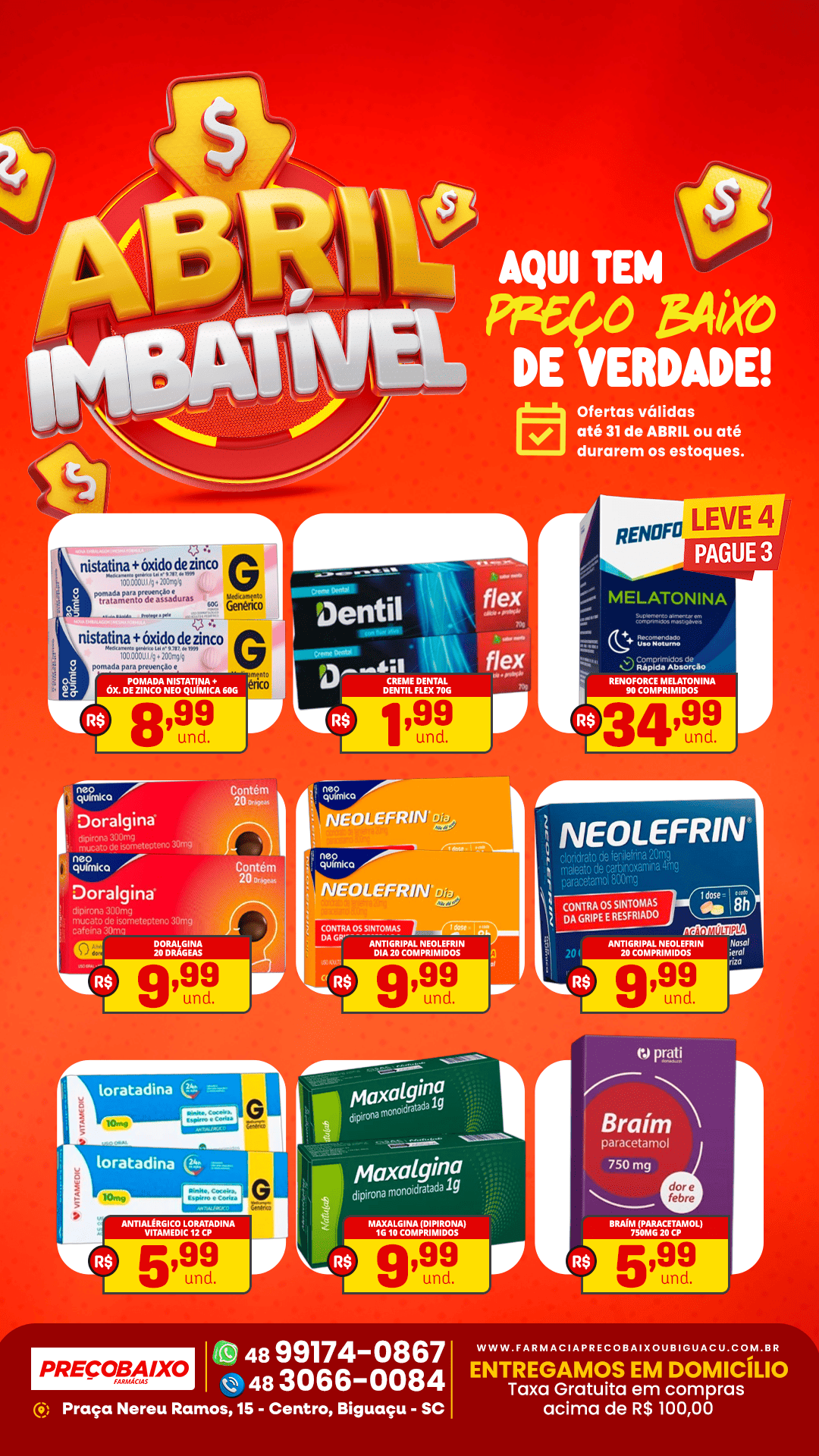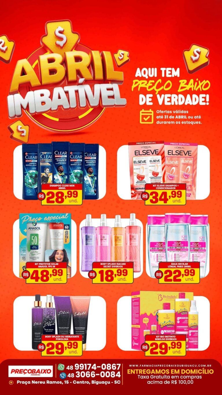 A Farmácia Preço Baixo iniciou a campanha “Abril Imbatível”, trazendo uma série de ofertas em medicamentos, produtos de higiene pessoal e itens de perfumaria com preços reduzidos para os moradores de Biguaçu. A ação promocional reúne desde medicamentos populares até kits de cuidados pessoais, com descontos considerados atrativos para o consumidor.