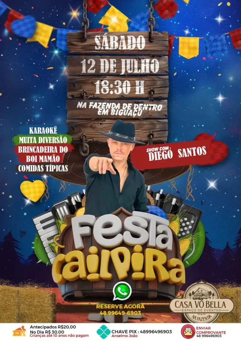 Uma noite de cultura, tradição e muita animação está marcada para acontecer no espaço de eventos Casa Vó Bella, localizado no Sítio do Anselmo. O evento, em clima de festa junina, convida o público a preparar o traje caipira e garantir o ingresso antecipado por apenas R$ 20,00 até o dia 8 de julho. Para validar a entrada promocional, é necessário enviar o comprovante de PIX e garantir o nome na lista de presença.