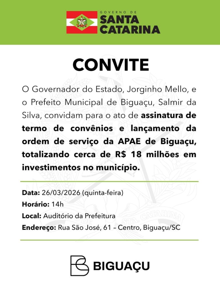 A iniciativa contará com a presença do governador do Estado, Jorginho Mello, e do prefeito de Biguaçu, Salmir Silva. O investimento representa uma das ações de maior impacto anunciadas para o município, especialmente voltada ao fortalecimento da estrutura de atendimento da Associação de Pais e Amigos dos Excepcionais (APAE).