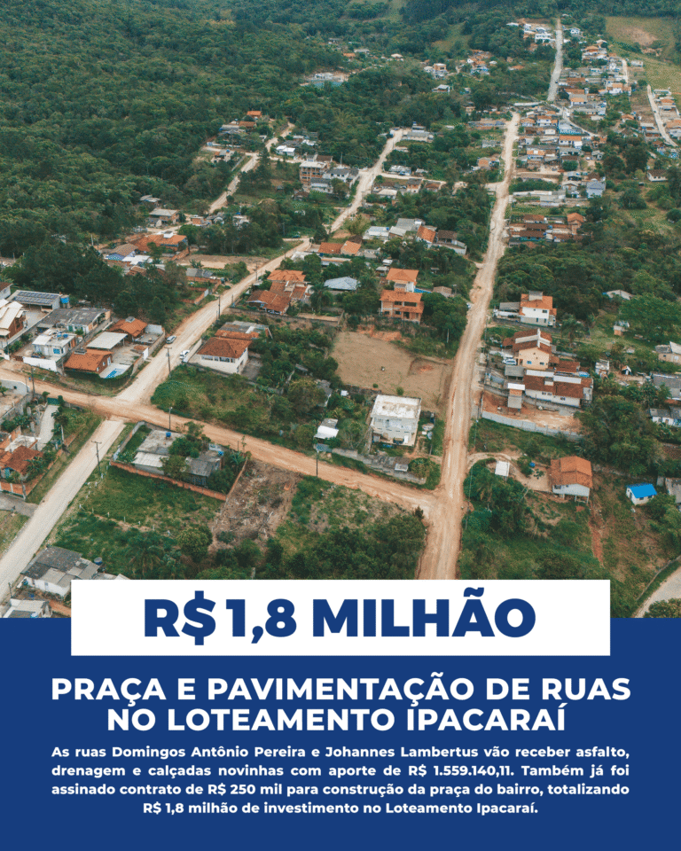 A Prefeitura de Biguaçu anunciou um investimento de R$ 1,8 milhão no Loteamento Ipacaraí, contemplando obras de pavimentação, drenagem e calçadas em duas importantes vias da comunidade: as ruas Domingos Antônio Pereira e Johannes Lambertus.