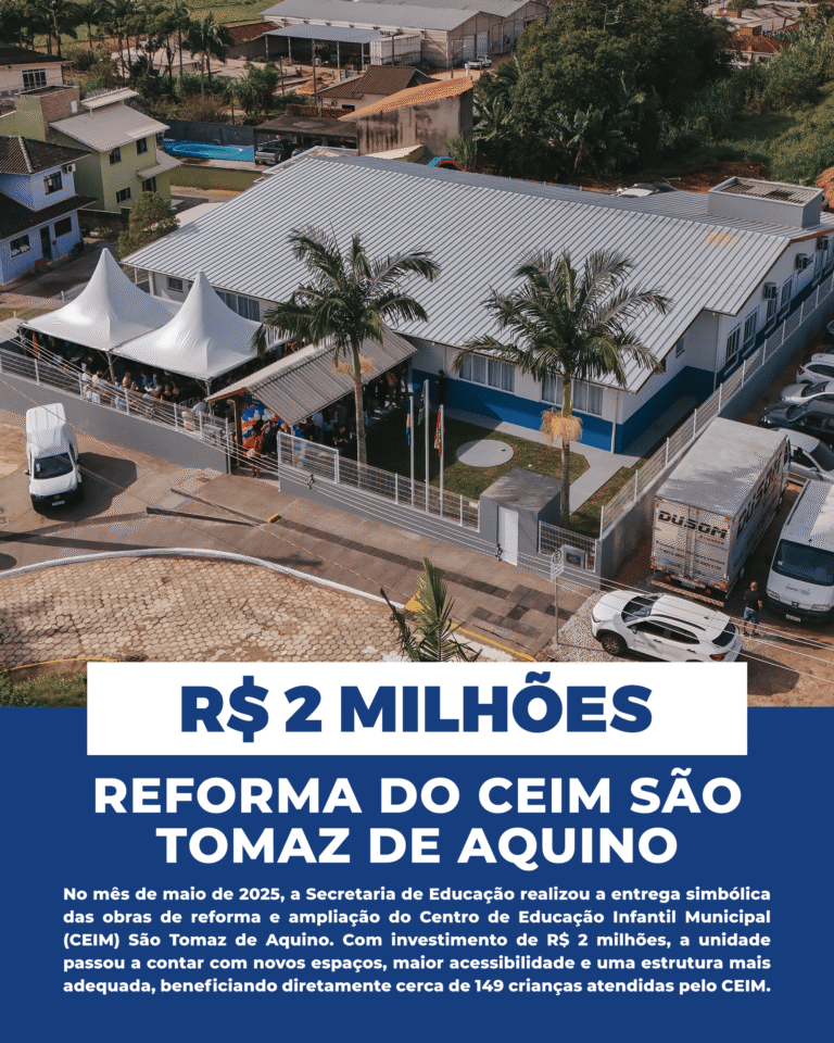 A Prefeitura de Biguaçu, por meio da Secretaria Municipal de Educação, realizou em maio de 2025 a entrega simbólica das obras de reforma e ampliação do Centro de Educação Infantil Municipal (CEIM) São Tomaz de Aquino.