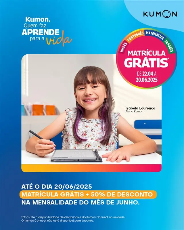 O Kumon de Biguaçu está com os últimos dias de matrículas grátis. A oferta vai até essa sexta-feira (20/06) e ainda por cima a mensalidade do mês de junho está com 50% de desconto. São oferecidos os cursos de inglês, matemática e português. Vale a pena conferir e conhecer o método revolucionário de ensino do Kumon. Quem estiver interessado basta entrar em contato através do whats app 48-99117-1525 ou direto no endereço rua Leopoldo Freiberger, 33 – sala 02 – Centro – Biguaçu.