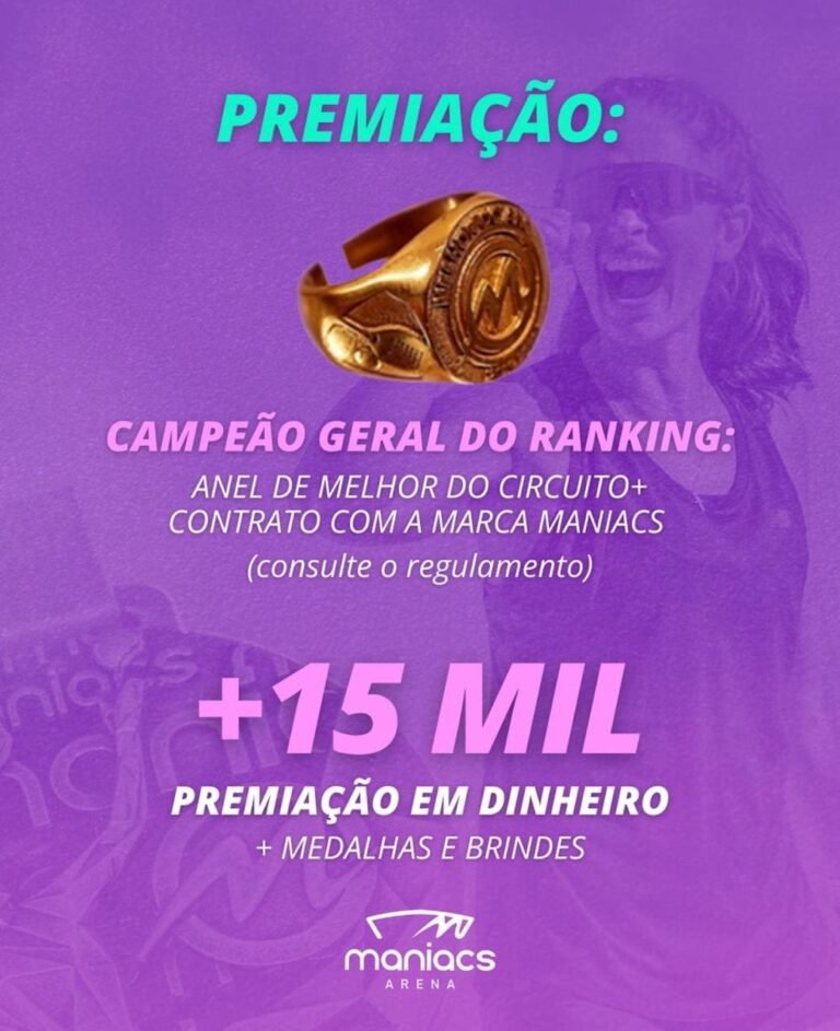 O torneio contempla categorias duplas e simples, nas modalidades masculina, feminina e mista, abrangendo faixas etárias que vão do sub-10 ao master 90+. Atletas profissionais também participam da disputa, com o campeão geral do ranking recebendo o título de melhor do circuito, além de contrato com a marca Maniacs.
