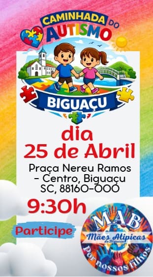 A caminhada será realizada na Praça Nereu Ramos, no Centro de Biguaçu, com início às 9h30. A proposta é reunir crianças, adolescentes e adultos autistas, além de familiares, apoiadores e a comunidade em geral, em um ato pacífico de conscientização e reivindicação.