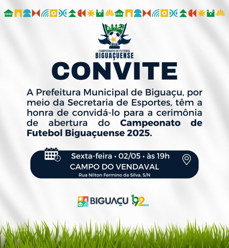 O Campeonato de Futebol Biguaçuense 2025 começa oficialmente nesta sexta-feira, dia 2 de maio, a partir das 19h, no campo do Vendaval, no bairro Vendaval. A Prefeitura Municipal de Biguaçu, em parceria com a Secretaria de Esportes, está convidando toda a comunidade para participar da abertura do torneio, que promete agitar os finais de semana da cidade nos próximos meses.