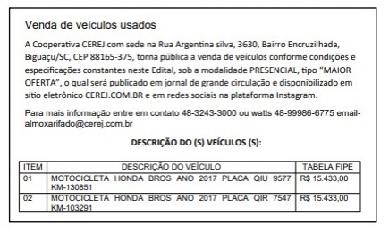A Cooperativa CEREJ, com sede na Rua Argentina Silva, nº 3630, no bairro Encruzilhada, em Biguaçu, tornou pública a abertura do processo de venda de veículos usados por meio de edital oficial. A comercialização será realizada na modalidade presencial, adotando o critério de “maior oferta”.