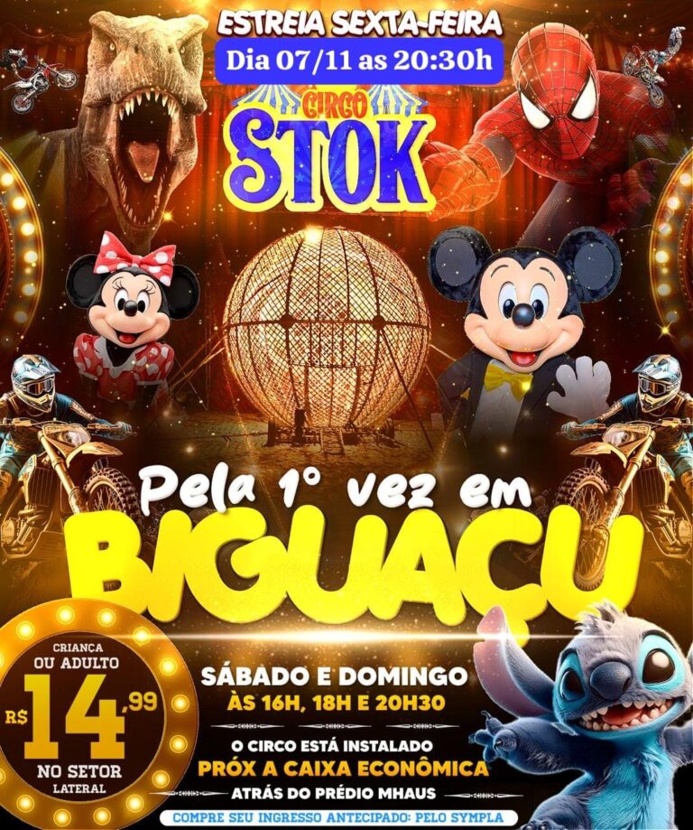 Pela primeira vez em Biguaçu, o Circo Stok chega à cidade prometendo encantar o público de todas as idades. A estreia está marcada para a sexta-feira, dia 7 de novembro, às 20h30, trazendo um espetáculo repleto de personagens queridos, efeitos especiais e muita emoção.