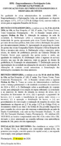 Já a reunião ordinária ocorrerá no dia 30 de abril de 2026, às 11h, no mesmo endereço. Na ocasião, os sócios deverão analisar as contas da administradora e deliberar sobre o balanço patrimonial e o resultado econômico dos exercícios de 2024 e 2025. Também será discutida a modificação do contrato social para adequação e criação de regras envolvendo exclusão de sócios, direito de retirada, falecimento, apuração e pagamento de haveres, cessão de quotas, distribuição de lucros e procedimentos de convocação e realização das reuniões.