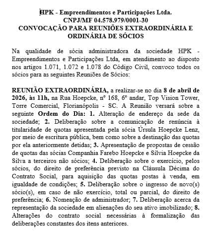 A reunião extraordinária está marcada para o dia 8 de abril de 2026, às 11h, na Rua Hoepcke, nº 168, 6º andar, Top Vision Tower, Torre Comercial, em Florianópolis. Entre os principais pontos da ordem do dia estão a alteração do endereço da sede da sociedade, deliberação sobre a renúncia de quotas apresentada pela sócia Úrsula Hoepcke Lenz e a destinação das participações anteriormente detidas por ela.