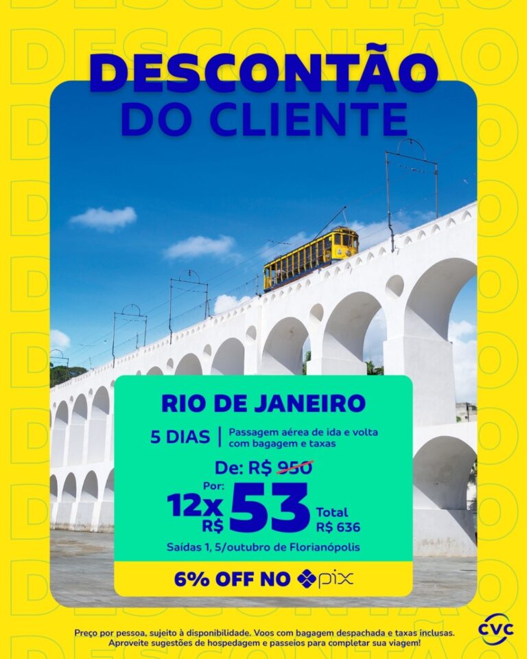 A CVC está com uma promoção exclusiva para quem deseja visitar o Rio de Janeiro. O pacote inclui passagens aéreas de ida e volta, com bagagem despachada e taxas inclusas, para uma estadia de 5 dias. A oferta parte de R$ 636 por pessoa, valor que pode ser parcelado em até 12 vezes de R$ 53.