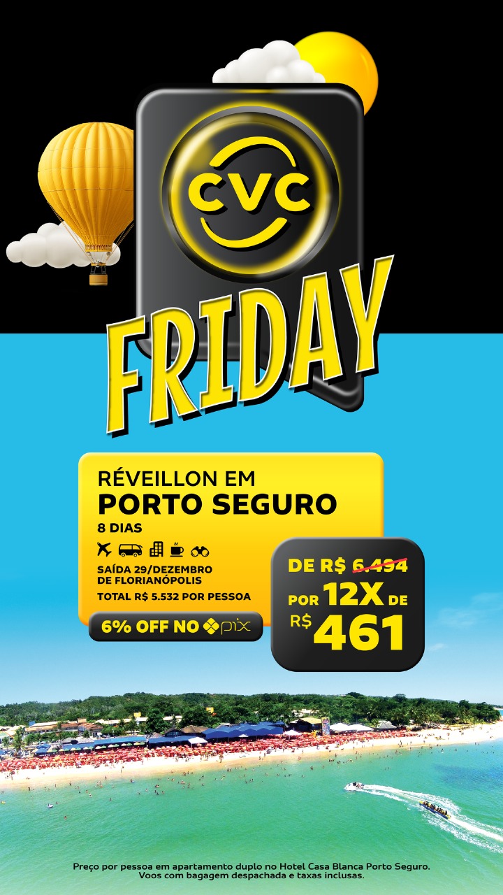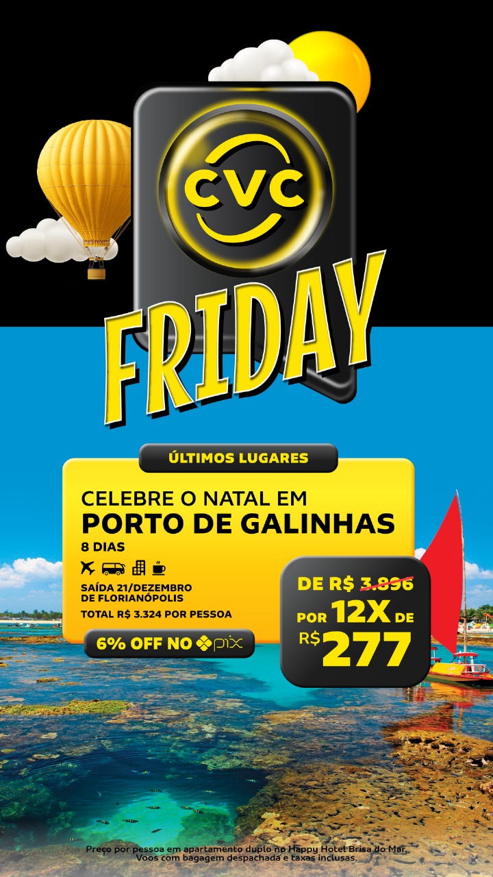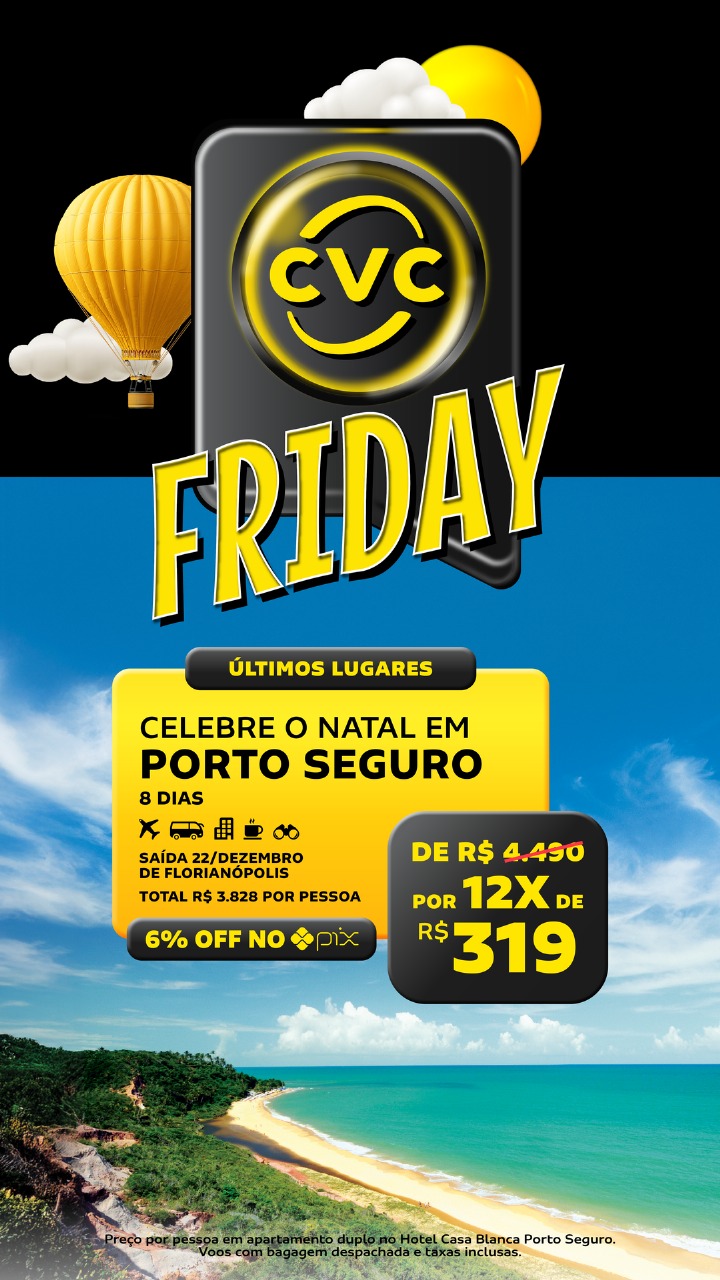 A tradicional campanha CVC Friday chegou com tudo neste fim de ano, trazendo pacotes promocionais completos para quem deseja aproveitar o Natal e o Réveillon em grande estilo. São opções com saídas de Florianópolis, incluindo passagens aéreas, hospedagem, taxas inclusas e descontos de 6% no pagamento via Pix.