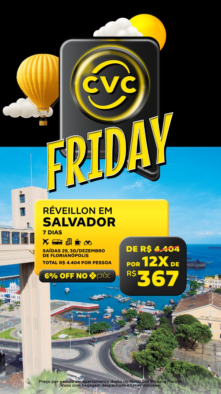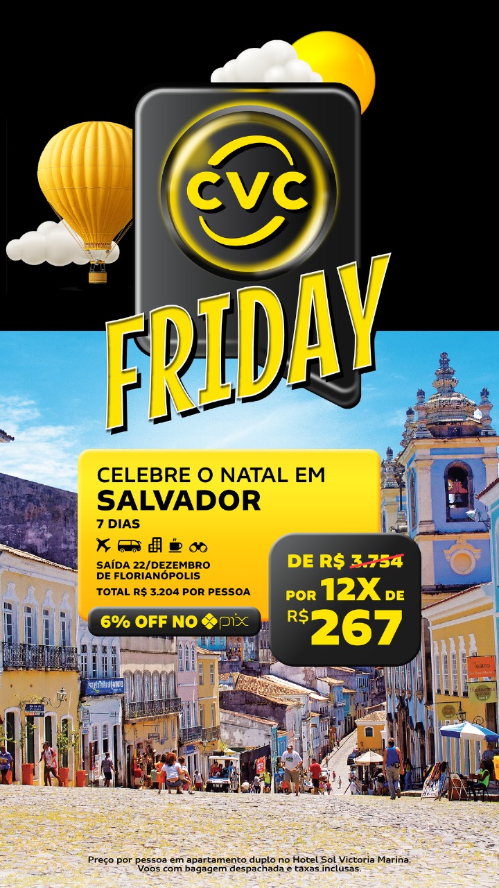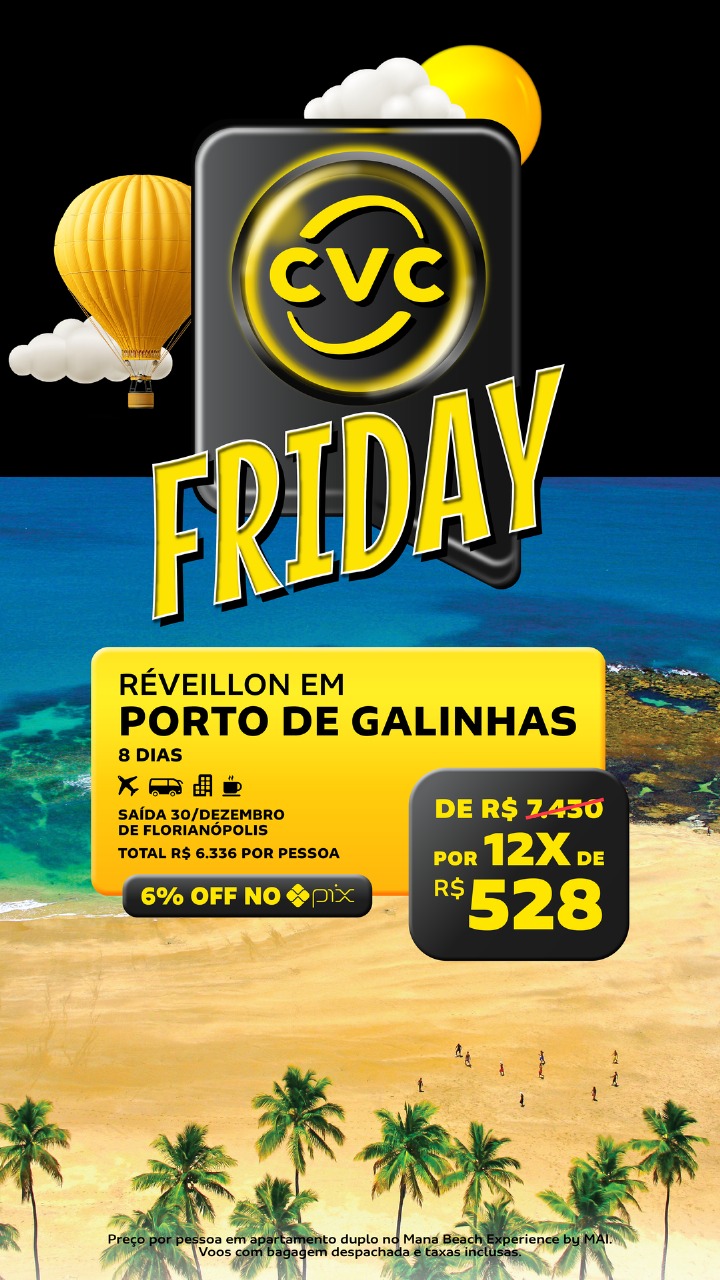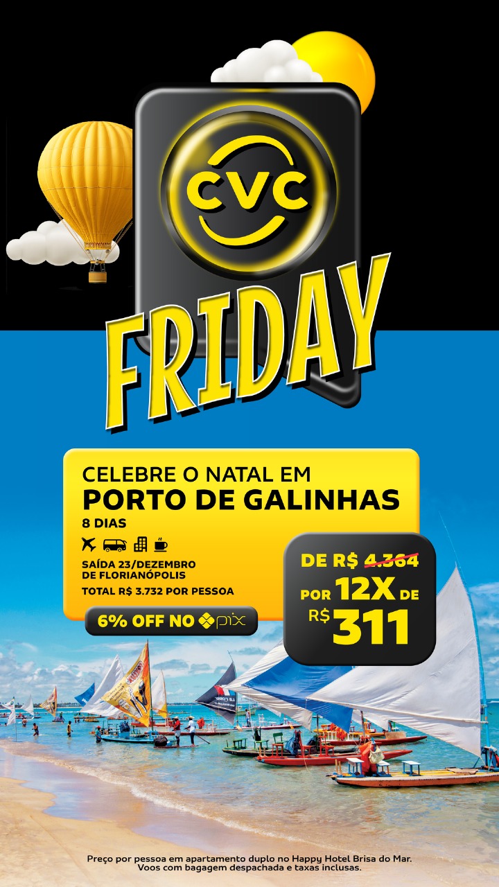 A tradicional campanha CVC Friday chegou com tudo neste fim de ano, trazendo pacotes promocionais completos para quem deseja aproveitar o Natal e o Réveillon em grande estilo. São opções com saídas de Florianópolis, incluindo passagens aéreas, hospedagem, taxas inclusas e descontos de 6% no pagamento via Pix.