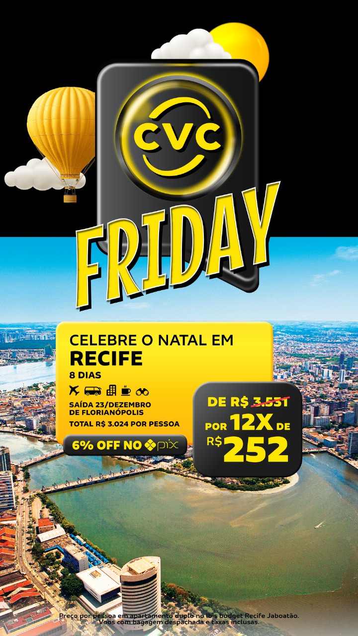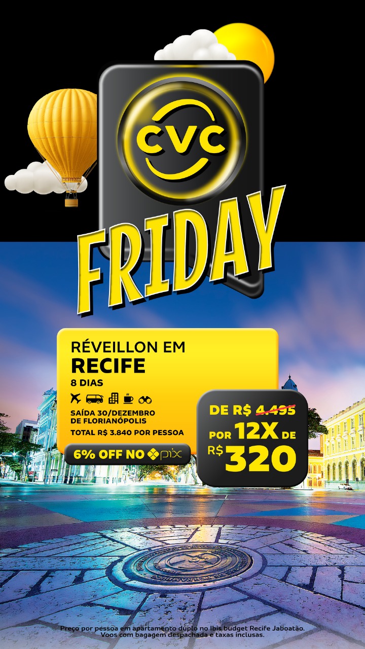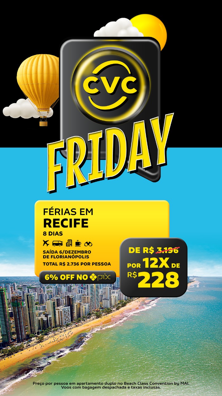 Os pacotes da CVC Friday têm vagas limitadas e podem ser adquiridos diretamente nas lojas CVC ou no site oficial. A promoção é válida por tempo determinado, conforme disponibilidade de assentos e hospedagens em cada destino.