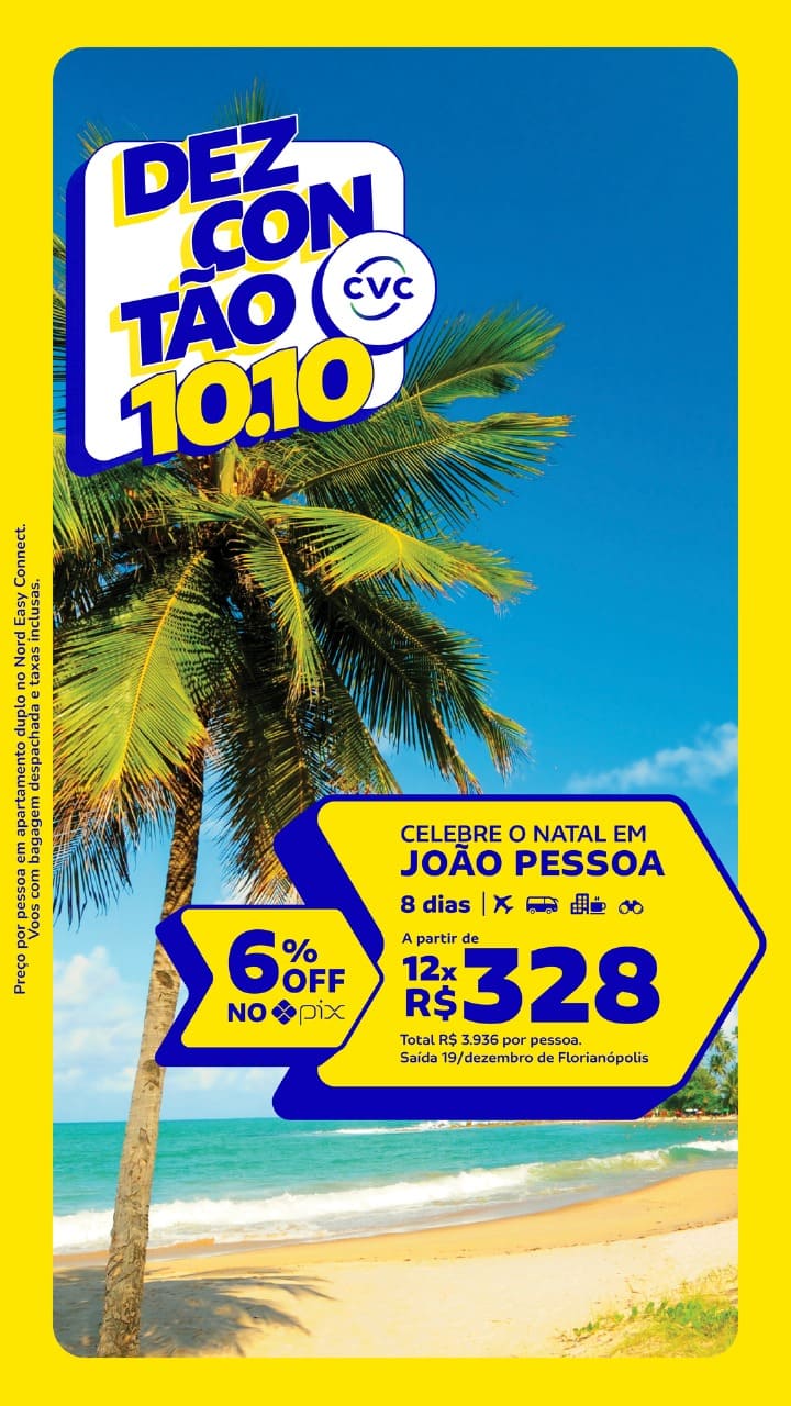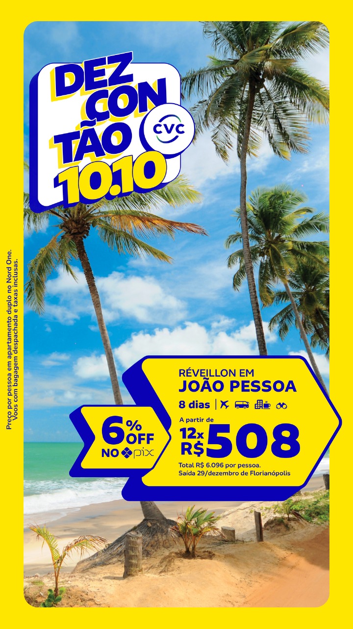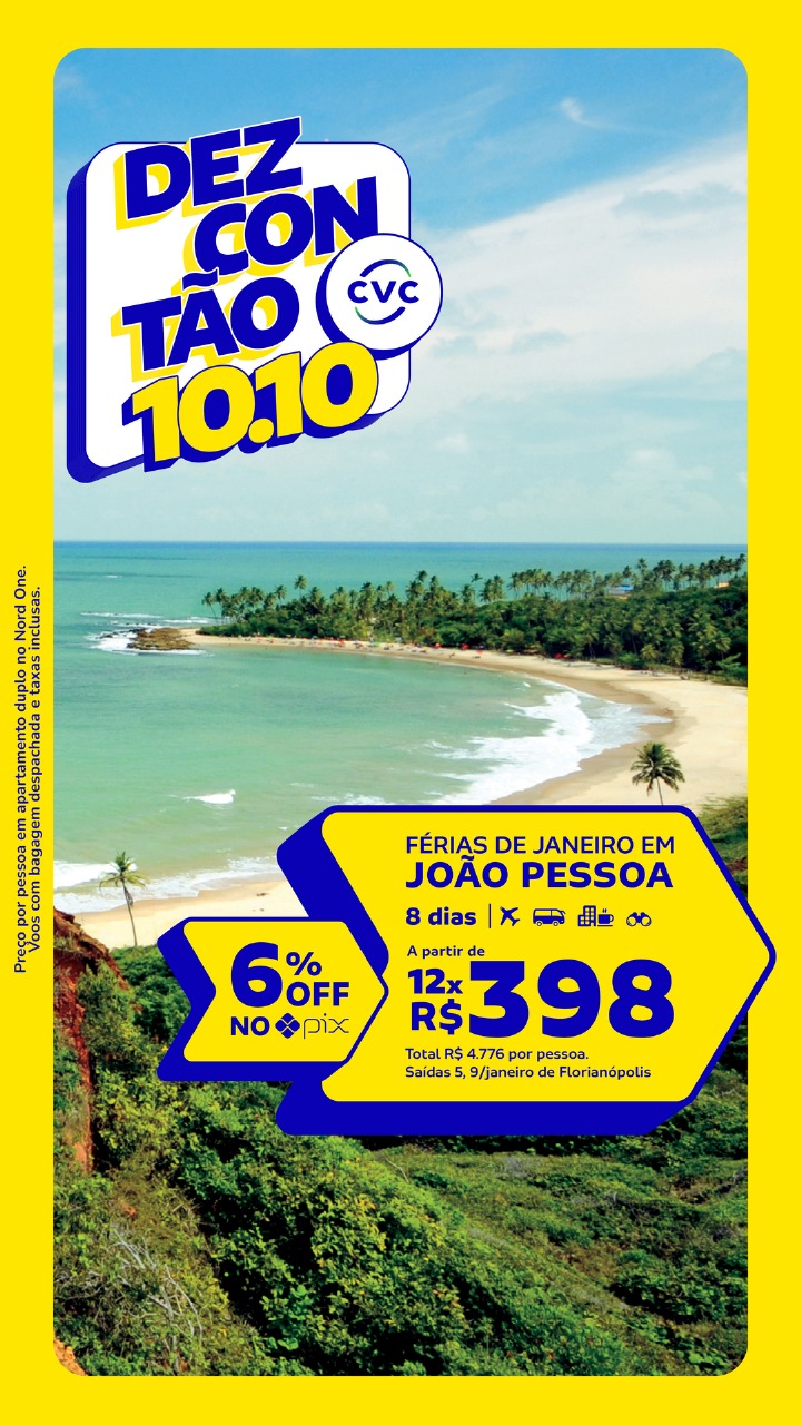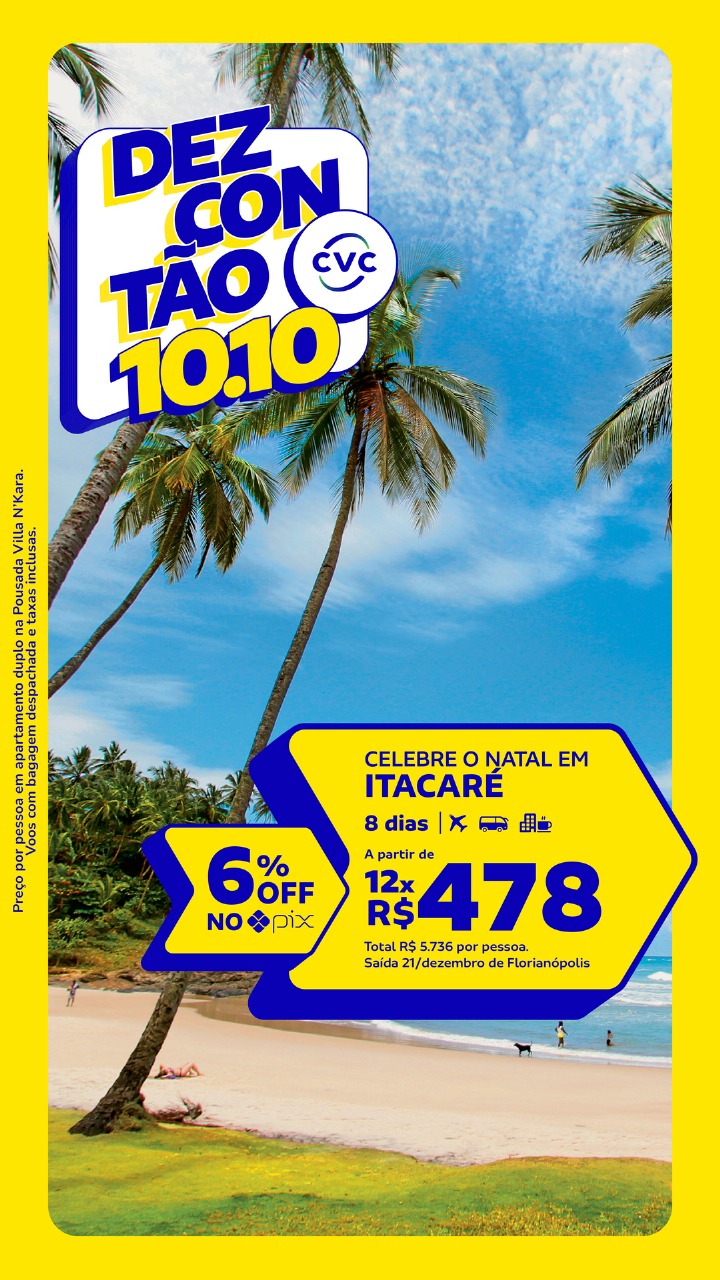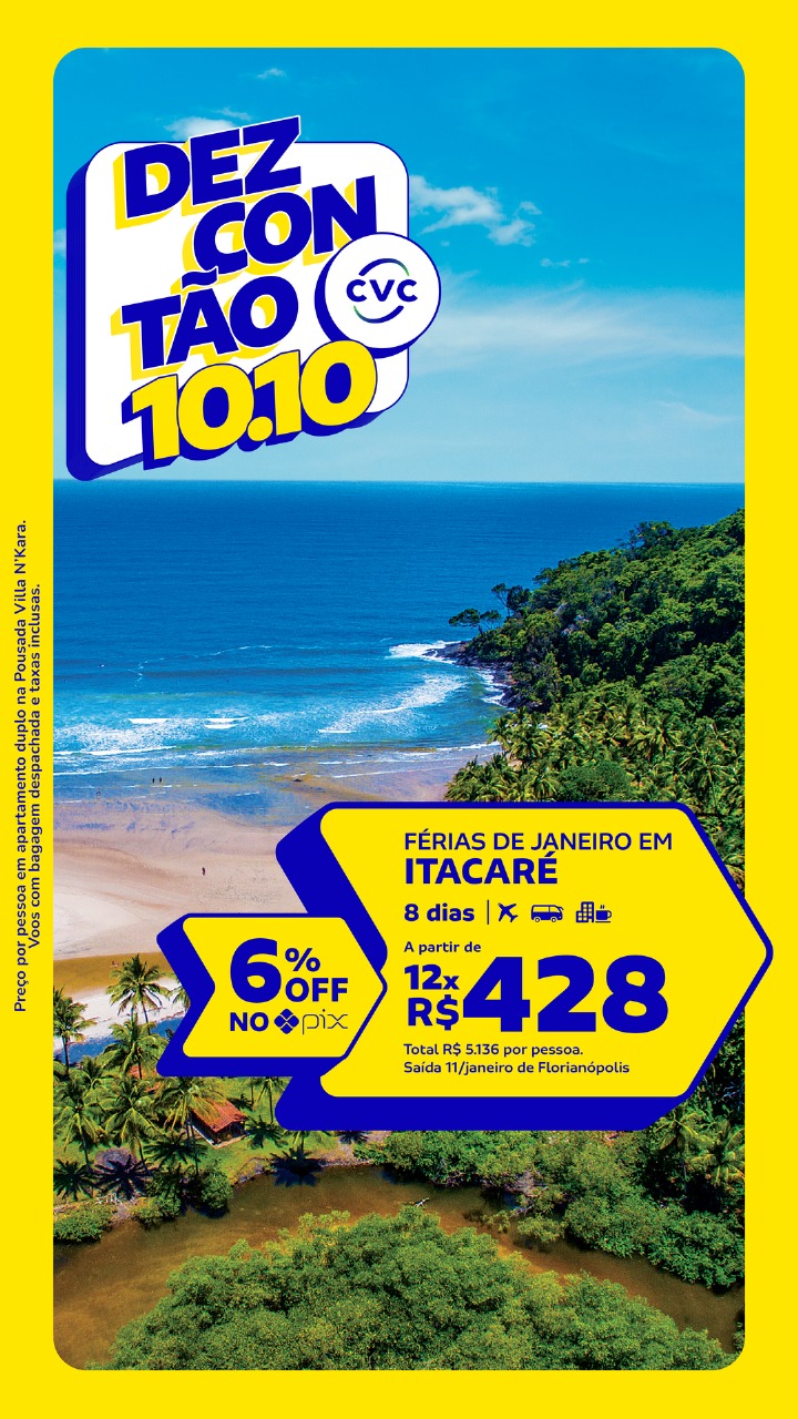 A CVC está promovendo o “Dezcontão 10.10”, campanha que oferece condições especiais em pacotes de viagem para o fim de ano e as férias de janeiro. As ofertas incluem destinos paradisíacos como João Pessoa (PB) e Itacaré (BA), com saída de Florianópolis e opções de até oito dias de hospedagem, passagens aéreas e passeios inclusos.