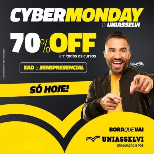 A UNIASSELVI lançou nesta segunda-feira (1º) uma promoção exclusiva de Cyber Monday, oferecendo 70% de desconto em todos os cursos de graduação e pós-graduação. A campanha é válida apenas por hoje, tanto para as modalidades EAD quanto semipresencial.