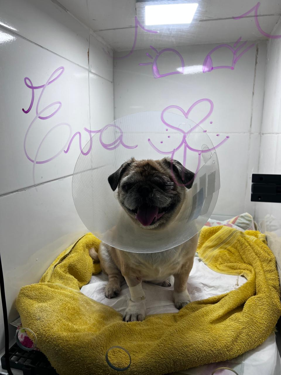 A médica-veterinária Dra. Isabella R. Guzatti (CRMV-SC 11527), especializada em oftalmologia veterinária, realizou uma cirurgia de emergência na Clínica FamilleVet, em Biguaçu, para tratar uma cadela da raça pug diagnosticada com úlcera de córnea, uma ferida que atinge a camada mais externa do globo ocular.