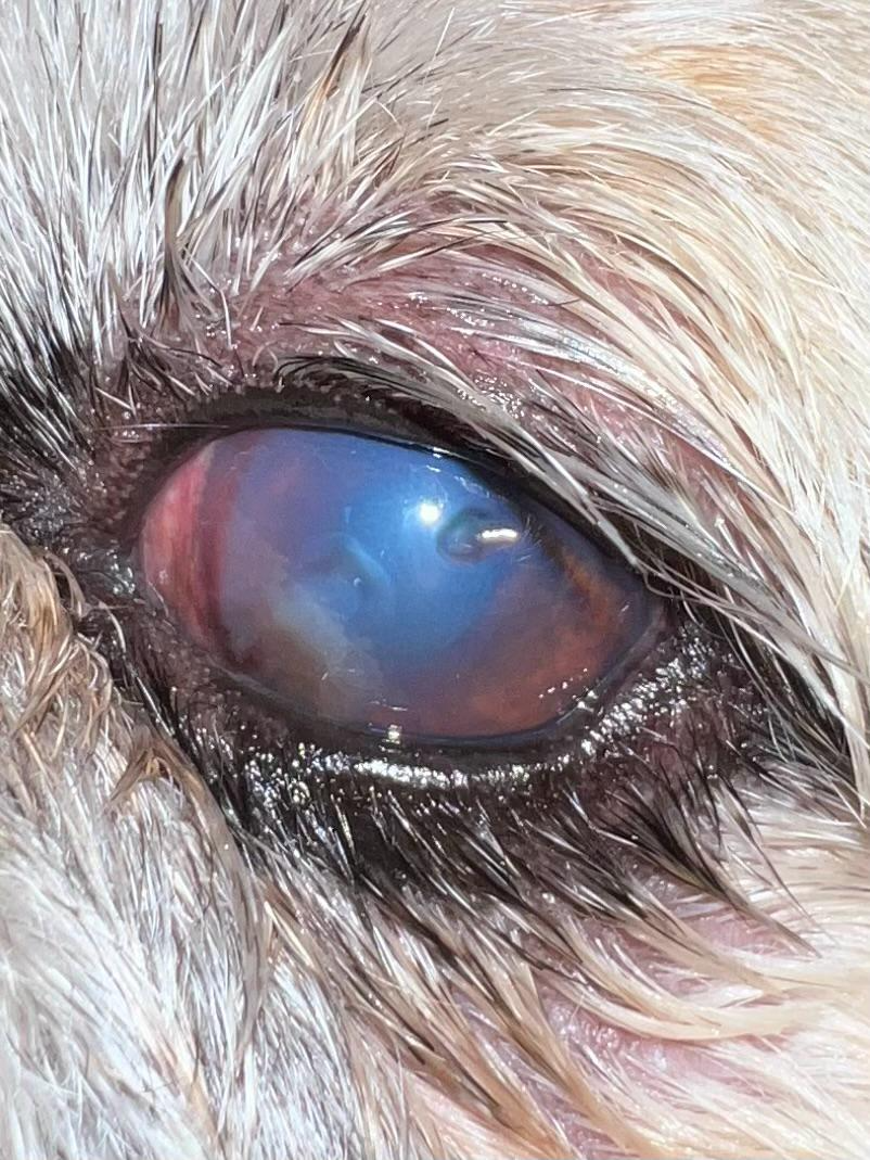 A paciente, chamada Eva, chegou à clínica com o olho fechado, secreção intensa e apresentando forte coceira no olho afetado — sintomas clássicos desse tipo de lesão. Segundo a Dra. Isabella, os cães braquicefálicos (de focinho curto), como pugs, shih tzus e bulldogs, são os que mais sofrem com esse tipo de problema.