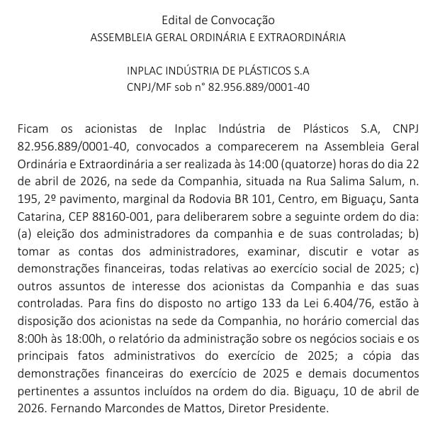 Os acionistas da Amparo Holding S/A e da Inplac Indústria de Plásticos S.A foram convocados para participarem das Assembleias Gerais Ordinárias e Extraordinárias que serão realizadas no dia 22 de abril de 2026, na sede das companhias, localizada na Rua Salima Salum, nº 195, 2º pavimento, marginal da Rodovia BR-101, no Centro de Biguaçu.