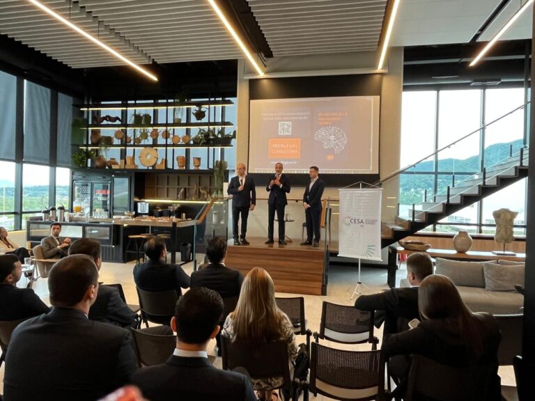 Giancarlo Castelan, presidente do CESA/SC e sócio do Núcleo Penal do Escritório, foi o anfitrião do encontro, que também contou com a participação de Rodrigo Carvalho, coordenador da Comissão de Direito Digital do CESA/SC. “Estamos trazendo um assunto que nos é muito caro e que tem impactado diretamente o mundo jurídico. Mais do que saber do que se trata a IA, hoje buscamos saber como ela está sendo aplicada, o que ela pode nos trazer efetivamente de ganhos e custos para os nossos escritórios, para a nossa atividade. Queremos entender como através dela podemos e devemos interagir com os outros atores do mundo jurídico, com quem estamos em contato diariamente”, pontua Castelan.