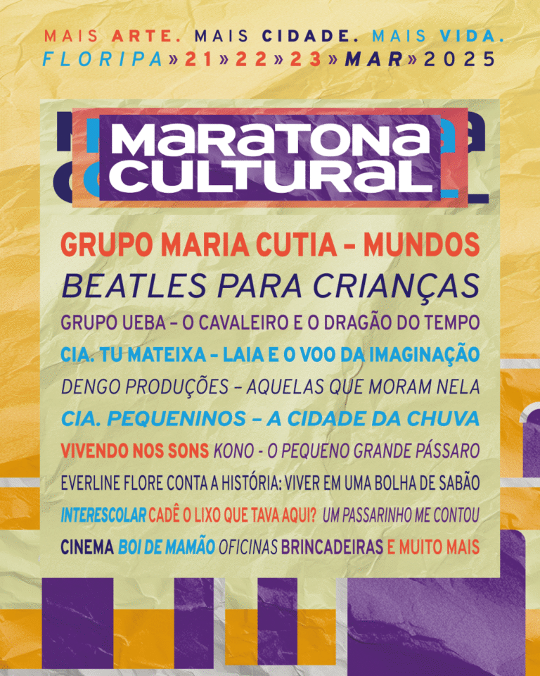 A 11ª edição da Maratona Cultural de Florianópolis ocorre neste fim de semana com a expectativa de reunir 200 mil pessoas em diferentes pontos da cidade. Com mais de 40 horas de programação gratuita, o evento reforça sua posição como o maior encontro multicultural de Santa Catarina, reunindo 480 ações culturais de diversas vertentes, trajetórias, origens e gerações nas áreas de música, teatro, literatura, dança, artes visuais e cultura urbana.