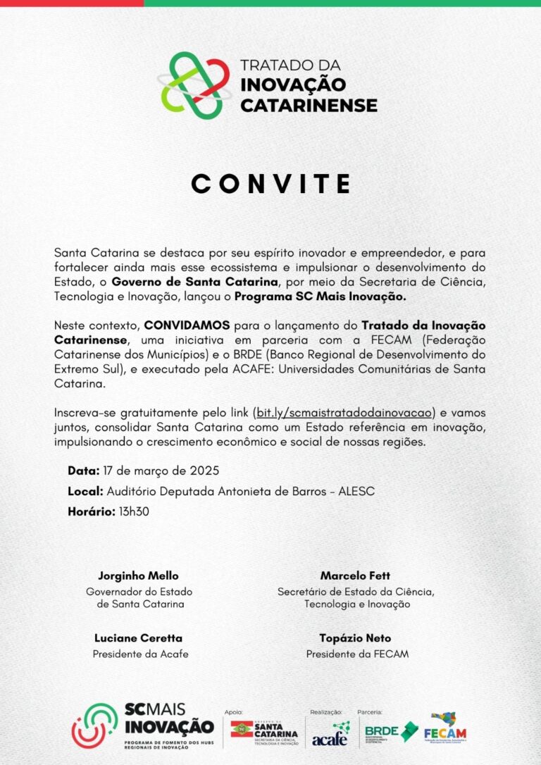 O Governo de Santa Catarina lança, na próxima segunda-feira, 17, às 13h30, o Tratado de Inovação Catarinense, uma das ações previstas do programa SC Mais Inovação da Secretaria da Ciência, Tecnologia e Inovação (SCTI) em parceria com a Federação Catarinense dos Municípios (FECAM). O ato contará com a presença do governador Jorginho Mello, do secretário da Ciência, Tecnologia e Inovação, Marcelo Fett, do presidente da FECAM, Topázio Neto, da presidente da ACAFE, Luciane Ceretta, do presidente da Associação Catarinense de Tecnologia (ACATE), Diego Ramos, Presidente da Federação das Indústrias do Estado de Santa Catarina (FIESC), Mario Aguiar, do Diretor Financeiro do Banco Regional de Desenvolvimento do Extremo Sul (BRDE), João Paulo Kleinubing e de outras autoridades.