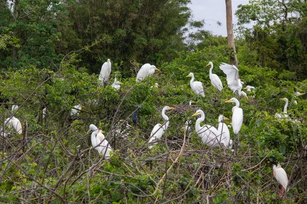 Entre as espécies mais observadas em São José estão a garça-branca-grande e a do colhereiro, conhecidas pela postura elegante e voo em formato de “S”. As garças medem entre 70 e 85 centímetros de altura, pesam em média de 3 a 5 quilos e se alimentam de peixes, anfíbios, crustáceos e insetos. Durante o período reprodutivo, vivem em bandos e constroem ninhos nas copas das árvores, formando verdadeiros “berçários naturais”.