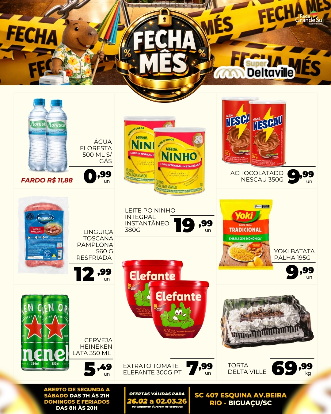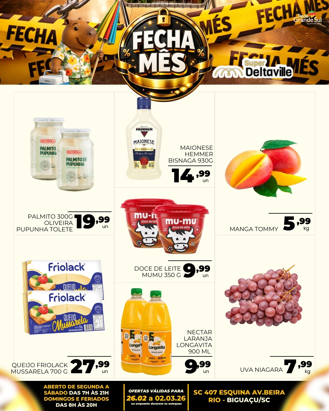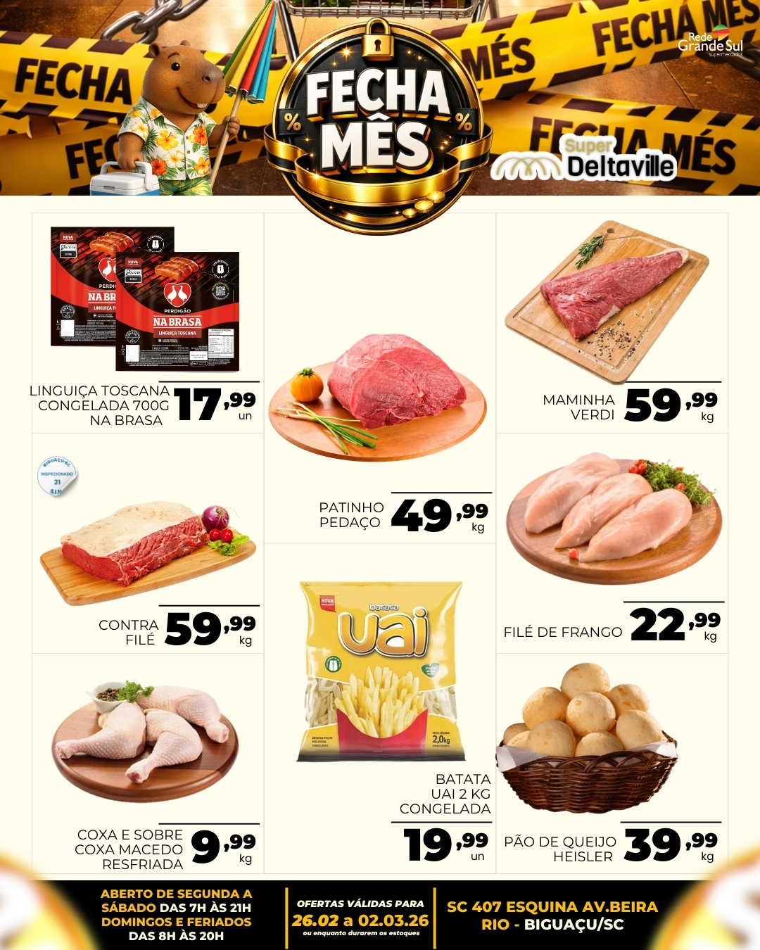 O Supermercado Deltaville, integrante da Rede Grande Sul, deu início à sua tradicional campanha “Fecha Mês”, trazendo uma seleção rigorosa de ofertas para os moradores de Biguaçu e região. As promoções, válidas de 26 de fevereiro (hoje) a 2 de março de 2026 (ou enquanto durarem os estoques), abrangem desde itens essenciais de limpeza até carnes nobres e hortifrúti.