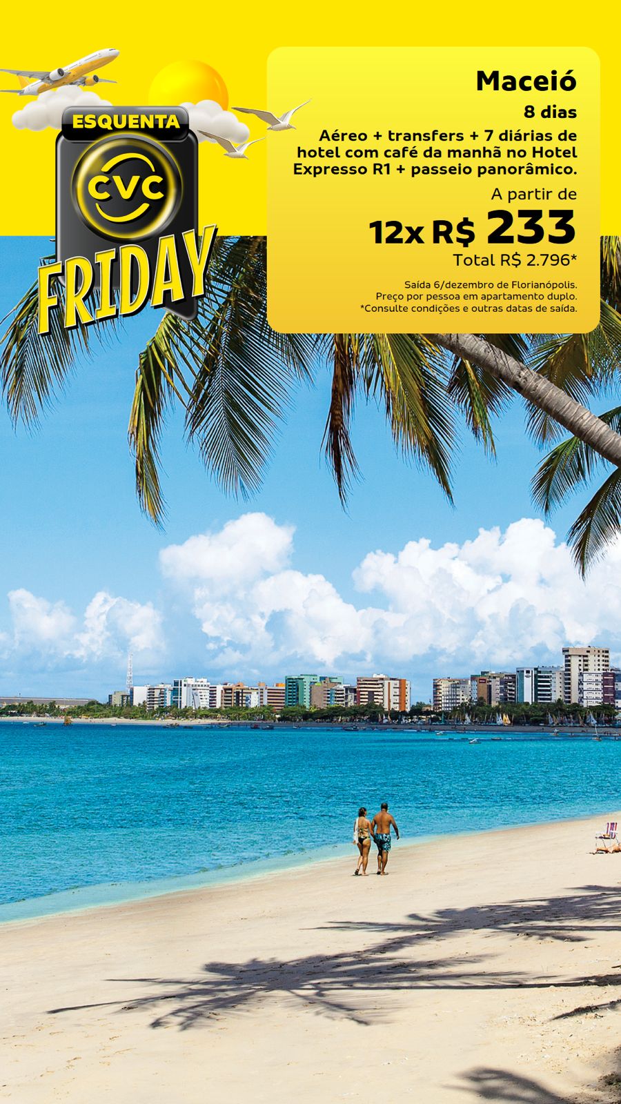 Para quem prefere o charme das praias brasileiras, Maceió é a pedida ideal. O pacote oferece 8 dias de viagem, com passagens aéreas de ida e volta com bagagem despachada, transfers de chegada e saída, 7 diárias com café da manhã no Hotel Expresso R1 e passeio panorâmico pela cidade. O valor parte de R$ 2.796 + taxas, ou 12x sem juros de R$ 233, por pessoa em apartamento duplo, válido também para saída no dia 6 de dezembro.