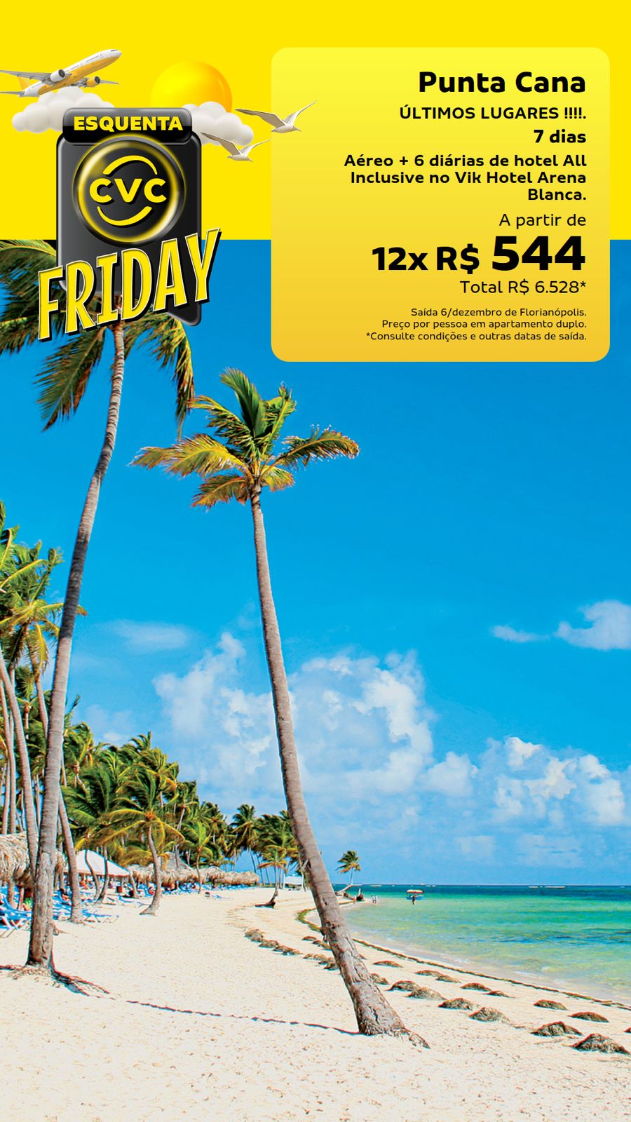 Já o pacote para Punta Cana é voltado para quem busca relaxar no Caribe, com 7 dias de viagem que incluem aéreo de ida e volta de Florianópolis e 6 diárias no Vik Hotel Arena Blanca, com sistema All Inclusive. O valor parte de R$ 6.528 + taxas, ou 12x sem juros de R$ 544, em apartamento duplo, válido para saída no dia 6 de dezembro. Mas é bom correr — os últimos lugares estão disponíveis.