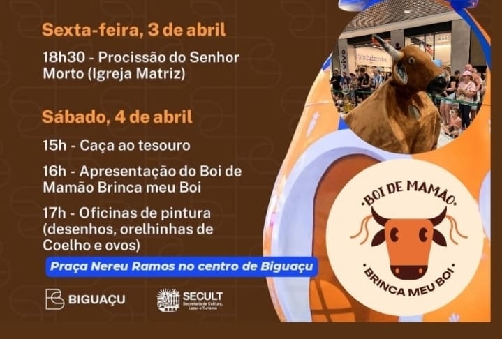 Páscoa em família: Praça de Biguaçu recebe grande evento com caçada, boi de mamão e atividades gratuitas