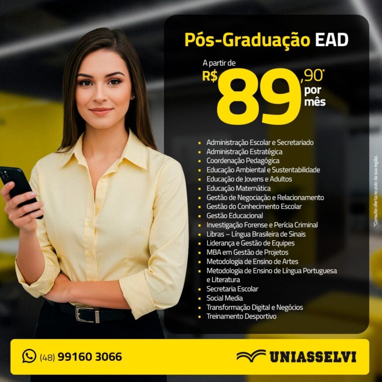 A metodologia EAD da Uniasselvi permite que o aluno estude com flexibilidade, conciliando os estudos com o trabalho e outras atividades. As matrículas já estão abertas e podem ser feitas diretamente pelo número de WhatsApp (48) 99160-3066.