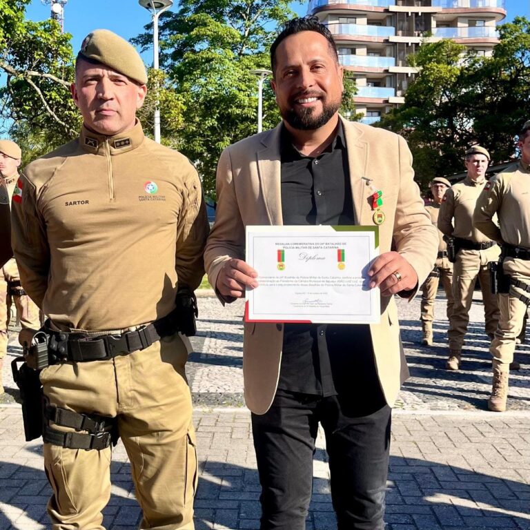 O presidente da Câmara Municipal de Biguaçu, vereador João Luiz Luz, foi homenageado na tarde de ontem com a medalha comemorativa do 24º Batalhão de Polícia Militar de Santa Catarina (BPM). A distinção foi entregue pelo comandante do Batalhão, tenente-coronel Sami de Medeiros Sartor, em uma cerimônia marcada por reconhecimento e gratidão àqueles que colaboram para o fortalecimento da segurança pública no município.