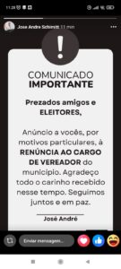 “Prezados amigos e eleitores, anuncio a vocês que, por motivos particulares, a renúncia ao cargo de vereador do município. Agradeço todo o carinho recebido nesse tempo. Seguimos juntos e em paz”, escreveu José André.