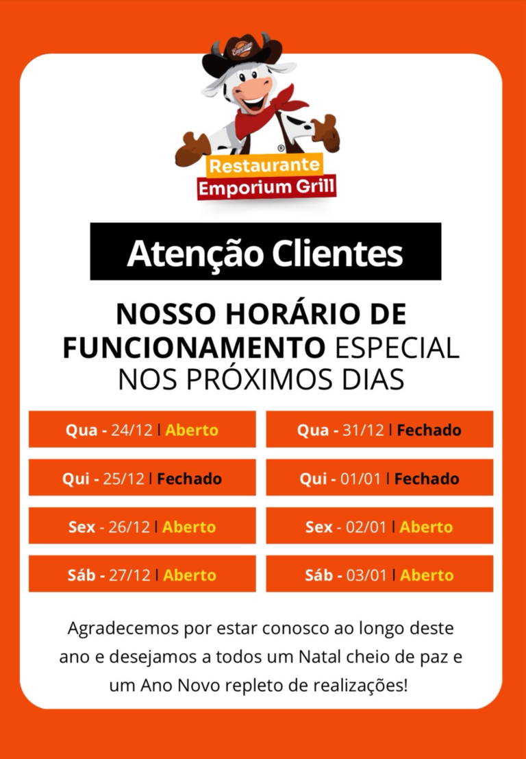 O Restaurante Emporium Grill divulgou seu horário especial de funcionamento para os próximos dias de celebrações de fim de ano. De acordo com o comunicado, o restaurante estará aberto nos dias 24, 26 e 27 de dezembro, e também nos dias 2 e 3 de janeiro. Já nas datas 25 e 31 de dezembro e 1º de janeiro, o estabelecimento não funcionará.