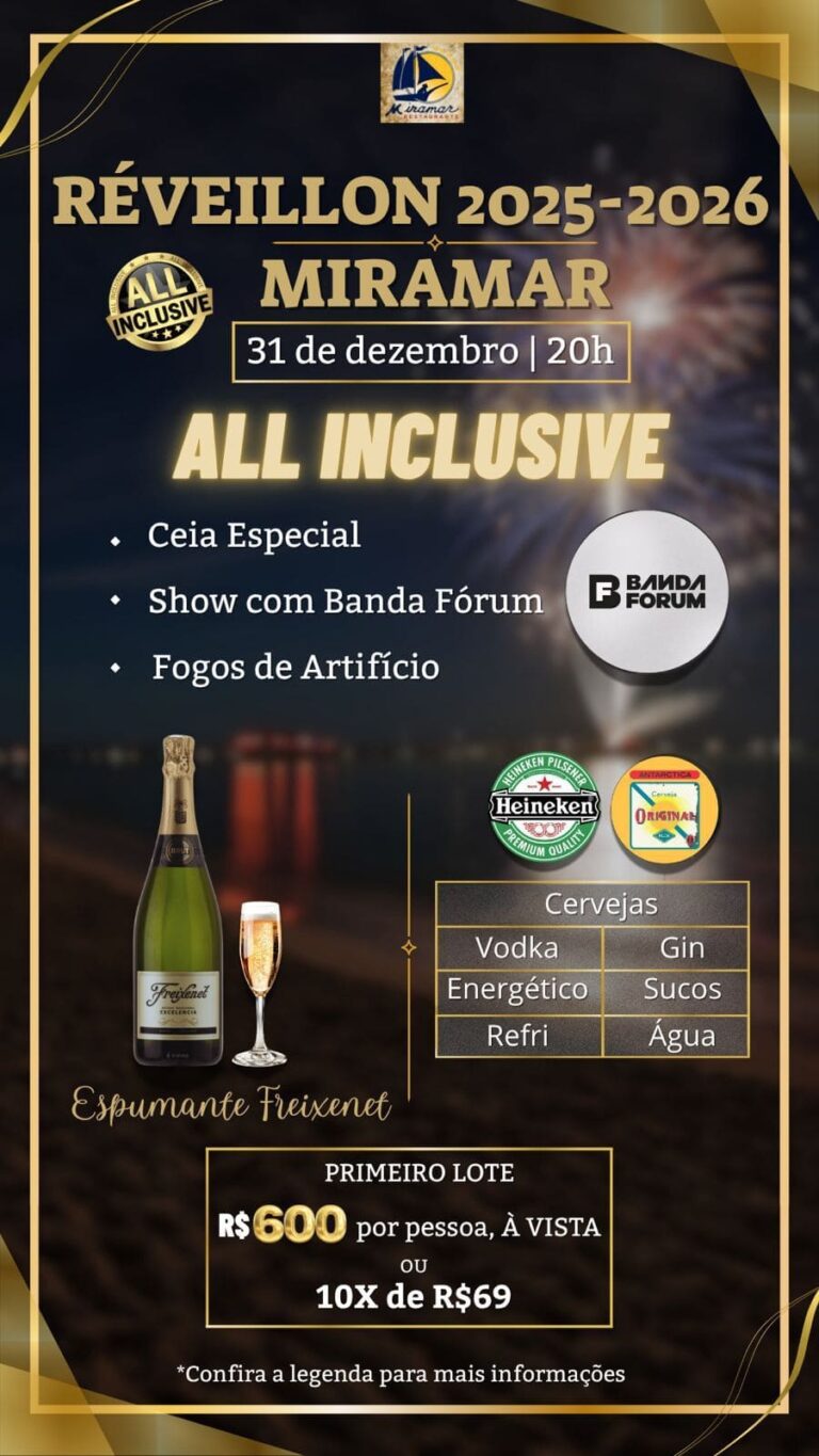 O tradicional Réveillon do Miramar, um dos mais aguardados do litoral catarinense, já tem data marcada e promete encantar o público na virada de 2025 para 2026. O evento acontece no dia 31 de dezembro, a partir das 20h, em formato all inclusive, oferecendo uma ceia especial, show ao vivo com a Banda Fórum e fogos de artifício para celebrar a chegada do novo ano em grande estilo.