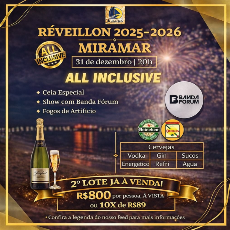 O tradicional Réveillon do Miramar promete encerrar 2025 em grande estilo e celebrar a chegada de 2026 com uma festa completa à beira-mar. O evento acontece no dia 31 de dezembro, a partir das 20h, em formato all inclusive, oferecendo uma noite repleta de música, gastronomia e diversão.