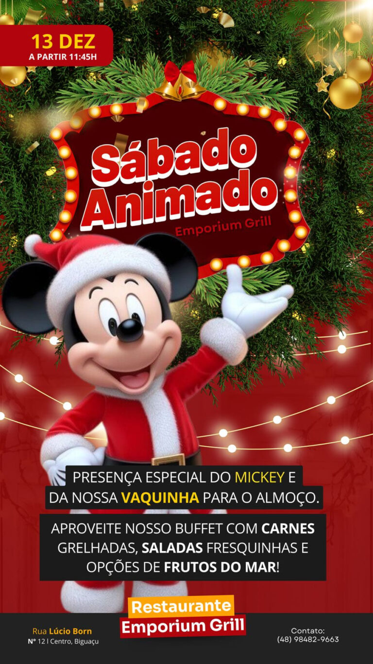 O Restaurante Emporium Grill, em Biguaçu, preparou um sábado especial para toda a família! A partir das 11h45 do dia 13 de dezembro, o local realiza o “Sábado Animado”, com a presença especial do Mickey e da Vaquinha, que vão alegrar o almoço e divertir as crianças.
