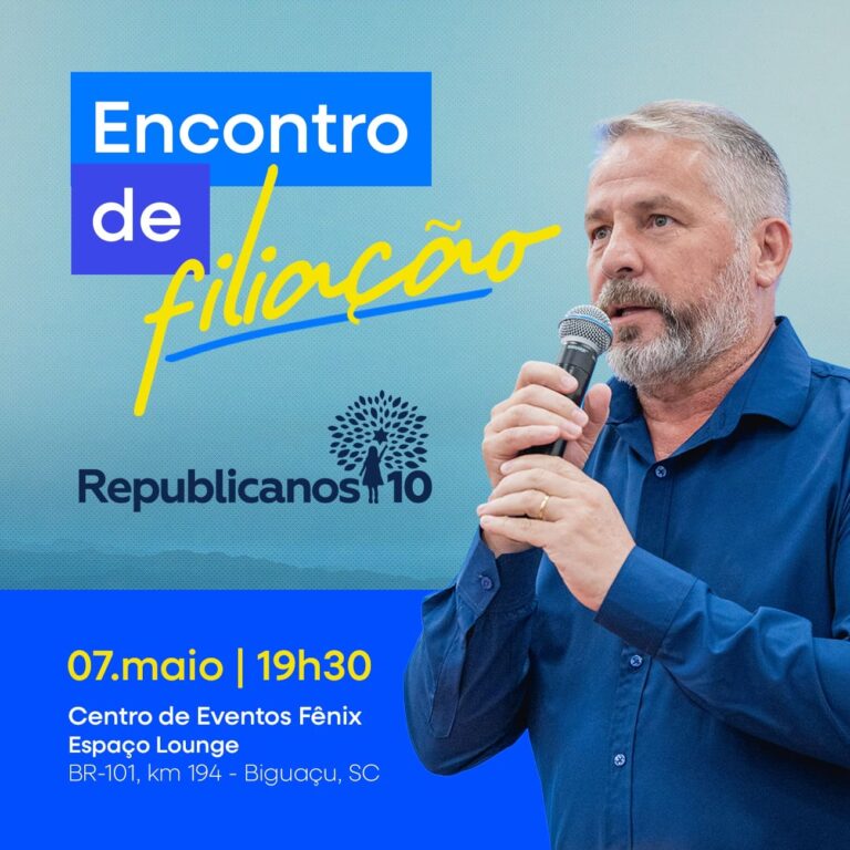 O pré-candidato a deputado estadual, Salmir, convida a comunidade de Biguaçu e região para participar de um ato de filiação ao partido Republicanos, que será realizado no próximo dia 7 de maio, às 19h30min, no Espaço Lounge do Centro de Eventos Fênix.