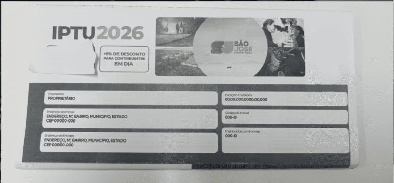 Neste ano, os contribuintes terão 5% de desconto para pagamento em cota única ou em duas parcelas. Quem estava adimplente até 12 de novembro de 2025 e optar pelo pagamento em cota única contará com desconto adicional de 5%, totalizando até 10% de abatimento.