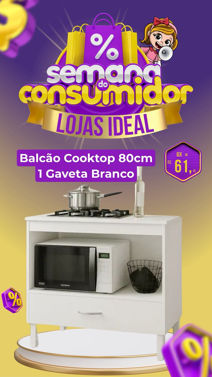 Outra oferta especial é o Balcão Cooktop de 80cm, na cor branca e com uma gaveta, pensado para otimizar o espaço da cozinha e facilitar a organização. Durante a campanha, o item pode ser comprado em 6 parcelas de R$ 61,90.
