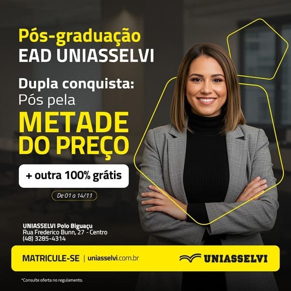 O Polo Uniasselvi de Biguaçu está com uma oferta imperdível para quem deseja investir na carreira e conquistar um novo título acadêmico. Até o dia 14 de novembro, ao se matricular em um curso de pós-graduação EAD, o aluno garante 50% de desconto e ainda ganha outra pós 100% gratuita, em uma campanha chamada “Dupla Conquista”.