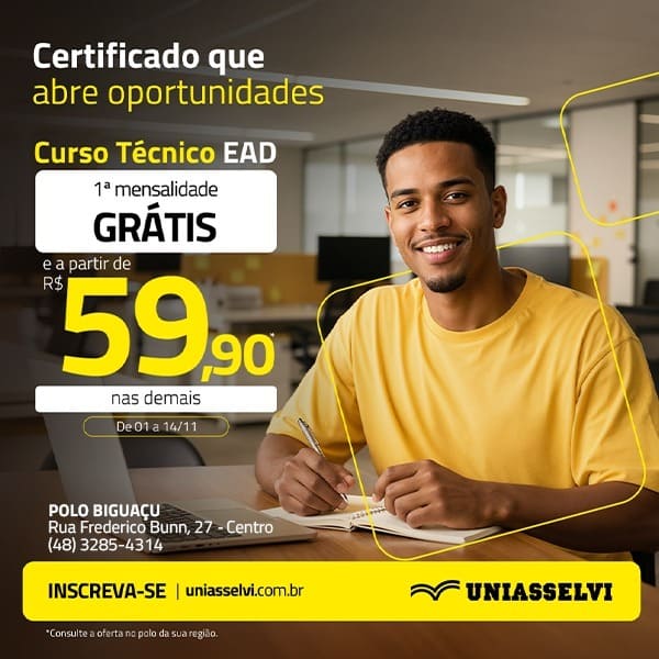 A Uniasselvi está com uma oportunidade especial para quem deseja investir na formação profissional. Até o dia 14 de novembro, o polo da instituição em Biguaçu oferece cursos técnicos na modalidade EAD com a primeira mensalidade gratuita e valores a partir de R$ 59,90 nas demais parcelas.