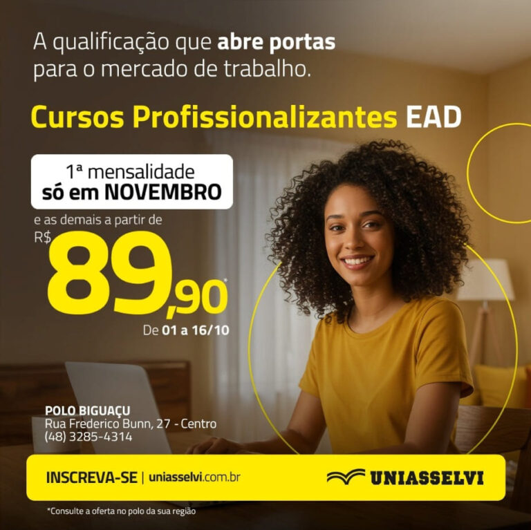 A Uniasselvi está com uma oportunidade imperdível para quem deseja se qualificar e conquistar uma nova colocação no mercado de trabalho. Entre os dias 1º e 16 de outubro, os cursos profissionalizantes EAD estão com mensalidades a partir de R$ 89,90, e a primeira mensalidade será cobrada apenas em novembro.