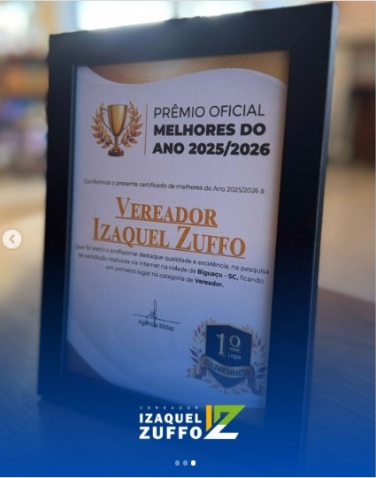 O vereador Izaquel Zuffo foi reconhecido como destaque na categoria Vereador no prêmio Melhores do Ano 2025/2026, em Biguaçu. A conquista representa, segundo o parlamentar, a confirmação de que o trabalho desenvolvido ao longo do mandato tem alcançado resultados positivos junto à população.