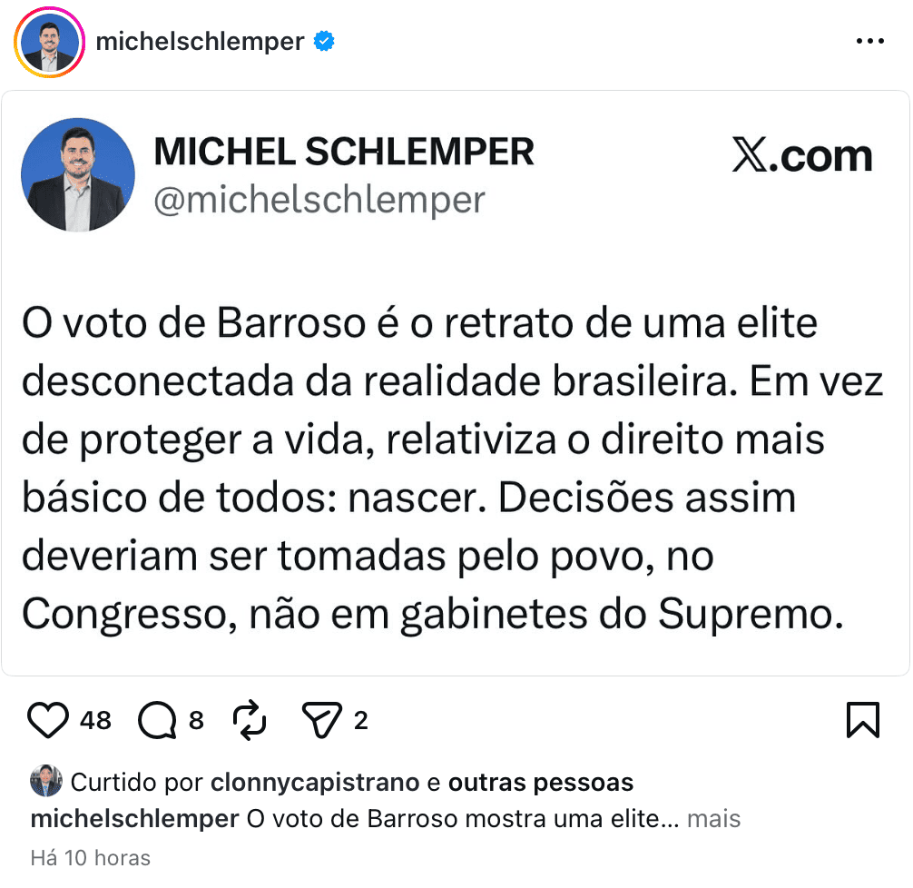 Vice-prefeito de São José critica voto de Barroso sobre aborto: “Elite desconectada do povo”